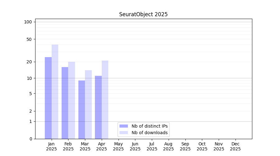 Number of downloads for software package SeuratObject, year by year, from 2025 back to 2014 (years with no downloads are omitted):
