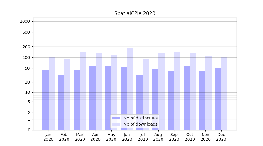 Number of downloads for software package SpatialCPie, year by year, from 2025 back to 2014 (years with no downloads are omitted):