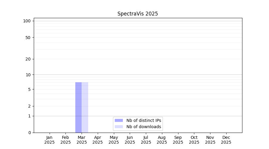 Number of downloads for software package SpectraVis, year by year, from 2025 back to 2014 (years with no downloads are omitted):