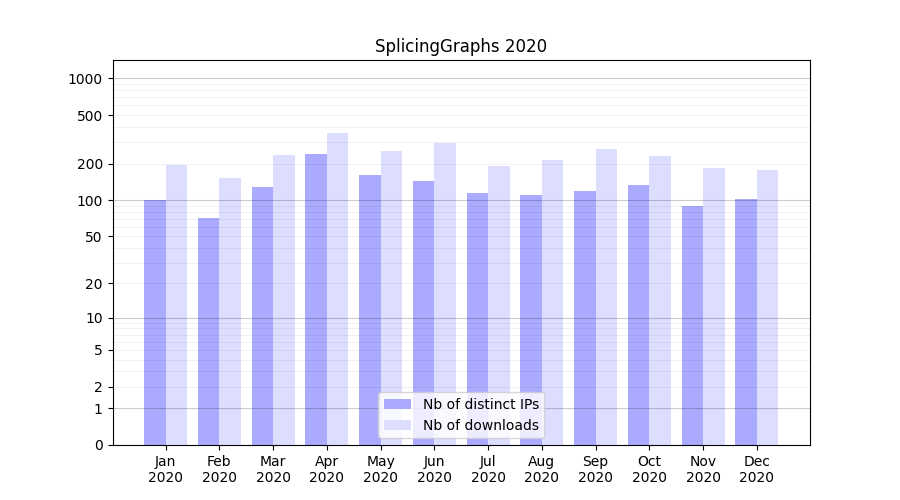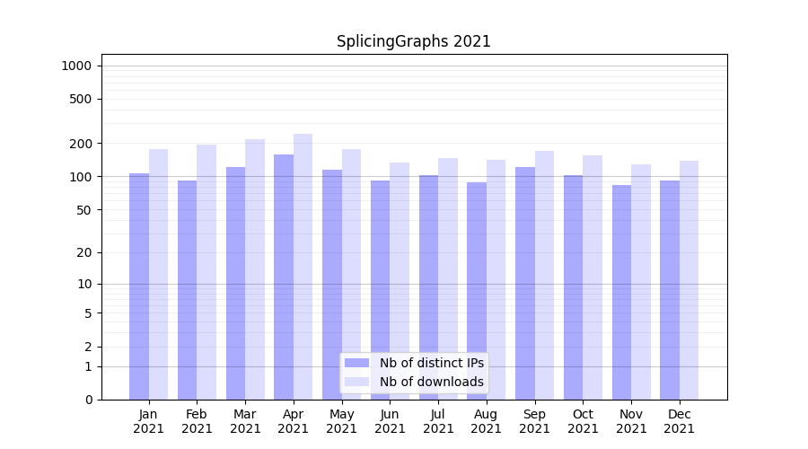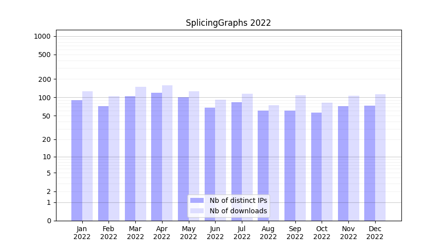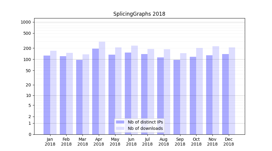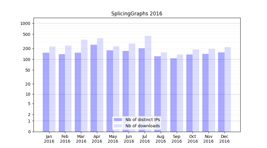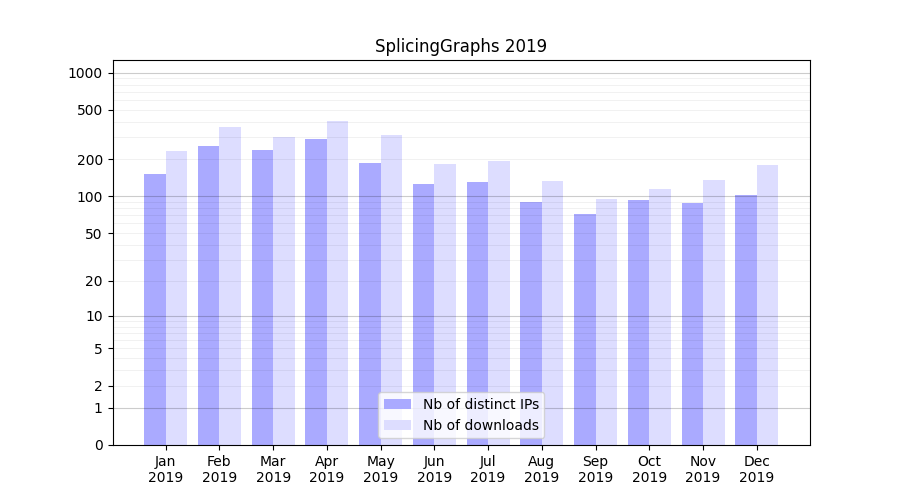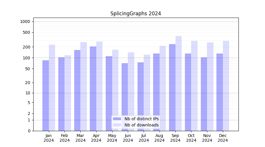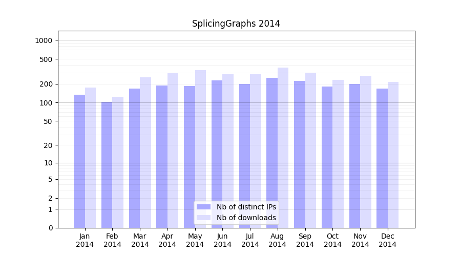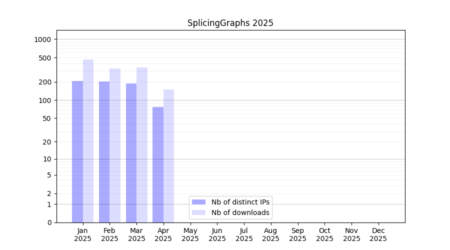 Number of downloads for software package SplicingGraphs, year by year, from 2025 back to 2014 (years with no downloads are omitted):