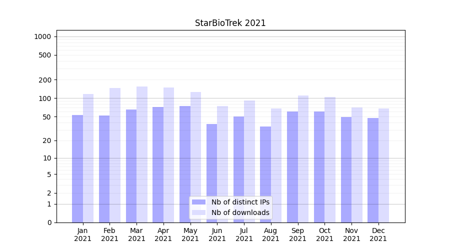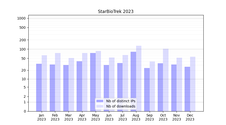 Number of downloads for software package StarBioTrek, year by year, from 2025 back to 2014 (years with no downloads are omitted):