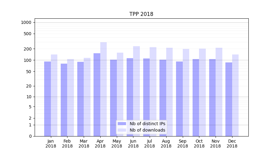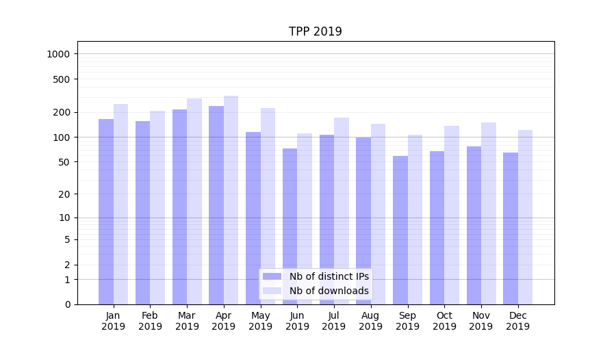 Number of downloads for software package TPP, year by year, from 2025 back to 2014 (years with no downloads are omitted):