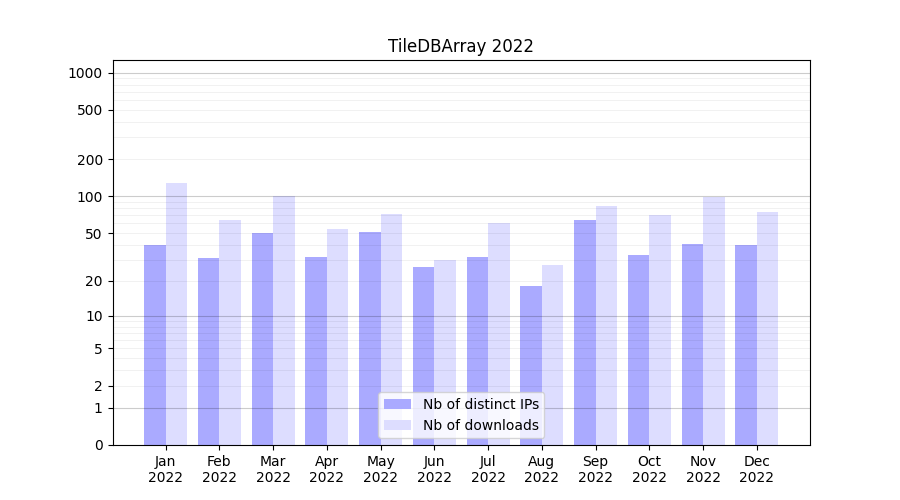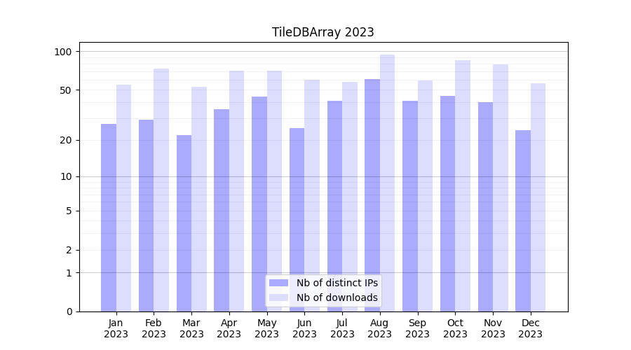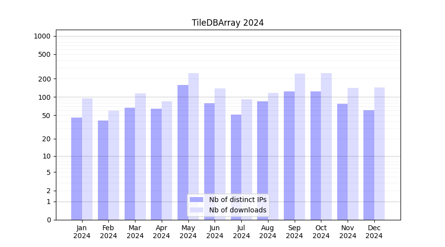 Number of downloads for software package TileDBArray, year by year, from 2025 back to 2014 (years with no downloads are omitted):