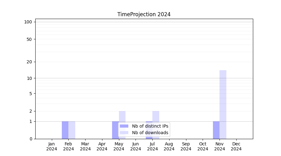 Number of downloads for software package TimeProjection, year by year, from 2025 back to 2014 (years with no downloads are omitted):