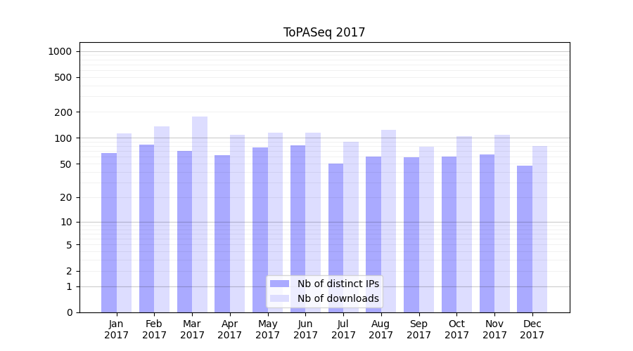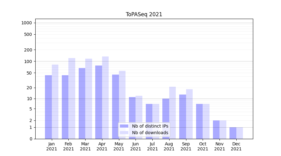 Number of downloads for software package ToPASeq, year by year, from 2025 back to 2014 (years with no downloads are omitted):