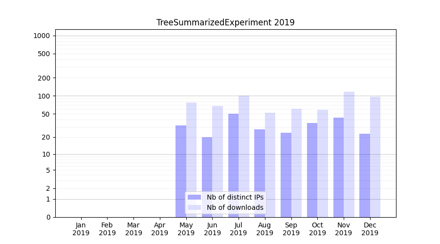 Number of downloads for software package TreeSummarizedExperiment, year by year, from 2025 back to 2014 (years with no downloads are omitted):