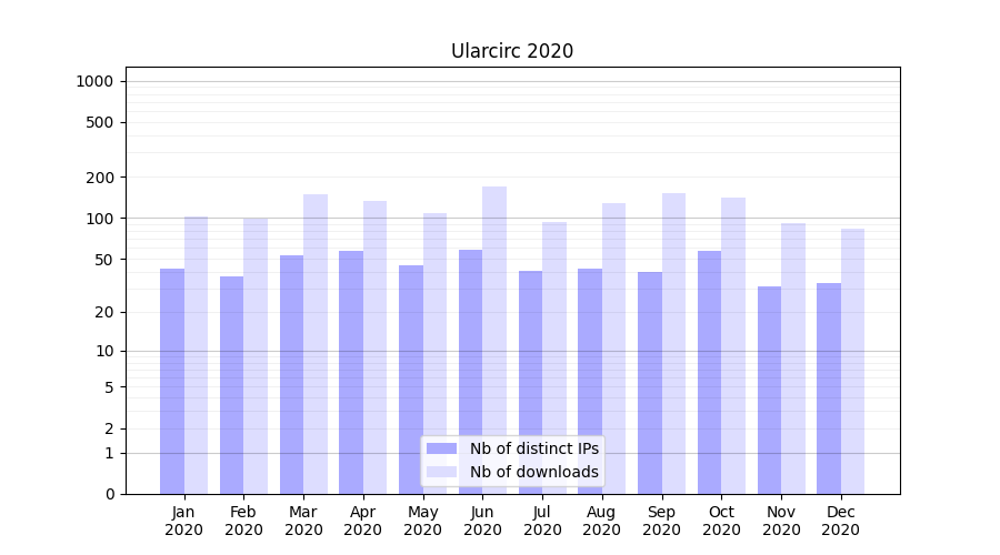Number of downloads for software package Ularcirc, year by year, from 2025 back to 2014 (years with no downloads are omitted):