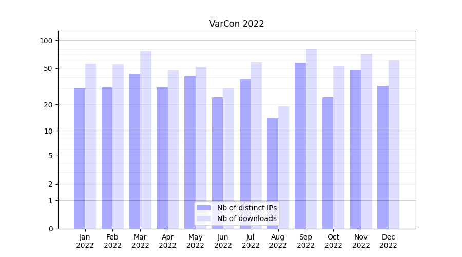 Number of downloads for software package VarCon, year by year, from 2025 back to 2014 (years with no downloads are omitted):