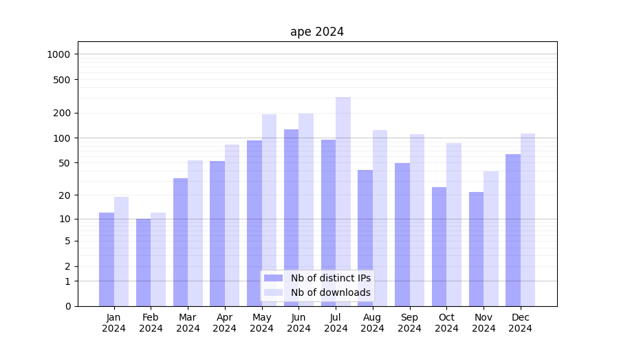 Number of downloads for software package ape, year by year, from 2025 back to 2014 (years with no downloads are omitted):