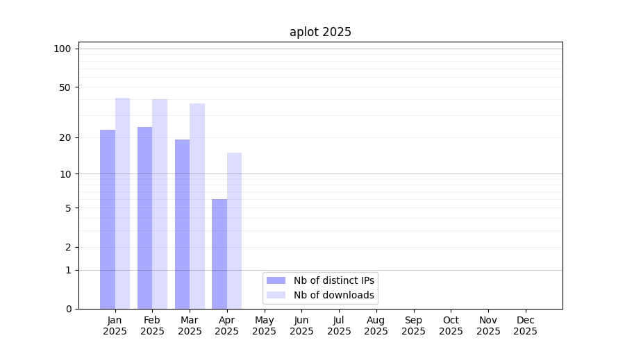 Number of downloads for software package aplot, year by year, from 2025 back to 2014 (years with no downloads are omitted):