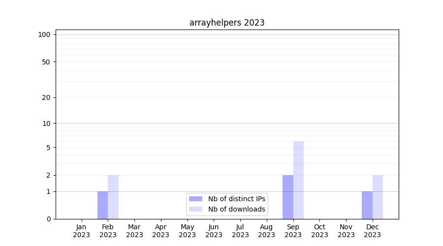 Number of downloads for software package arrayhelpers, year by year, from 2025 back to 2014 (years with no downloads are omitted):