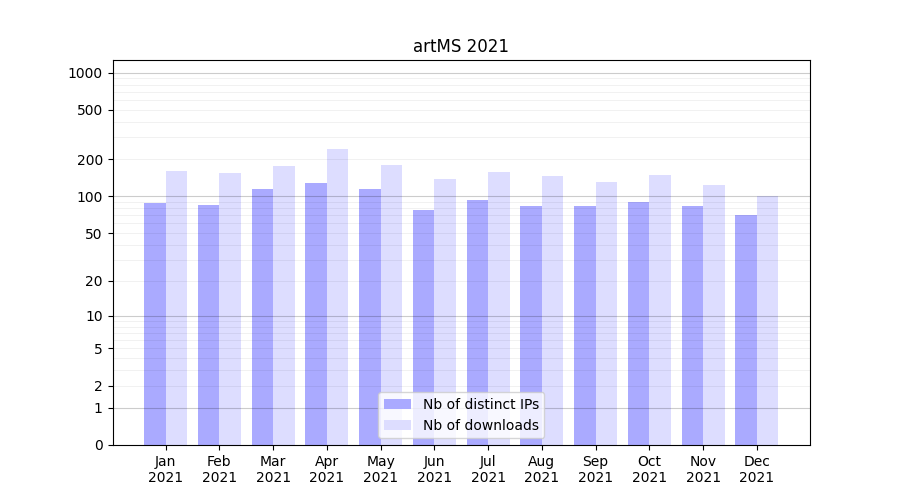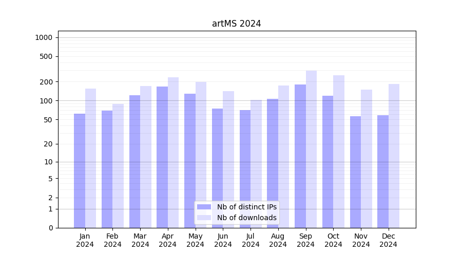 Number of downloads for software package artMS, year by year, from 2025 back to 2014 (years with no downloads are omitted):