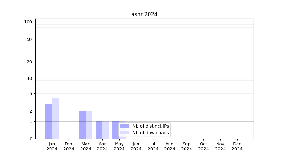 Number of downloads for software package ashr, year by year, from 2025 back to 2014 (years with no downloads are omitted):