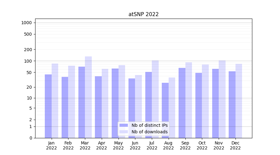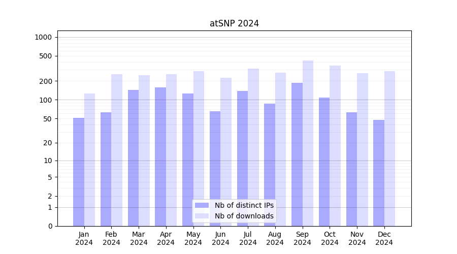 Number of downloads for software package atSNP, year by year, from 2025 back to 2014 (years with no downloads are omitted):