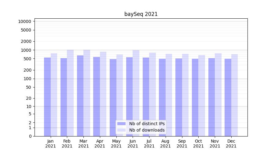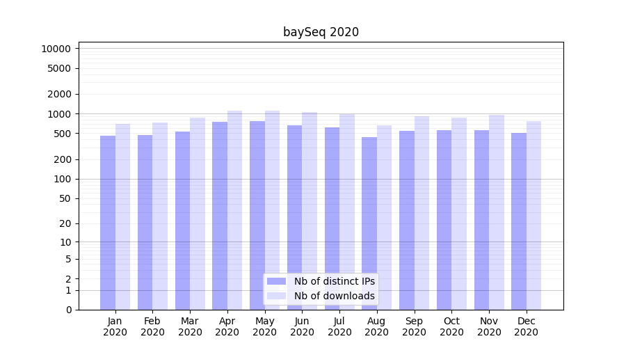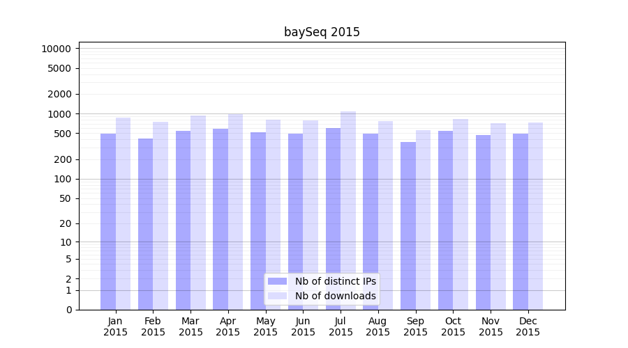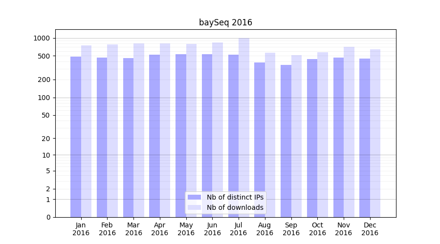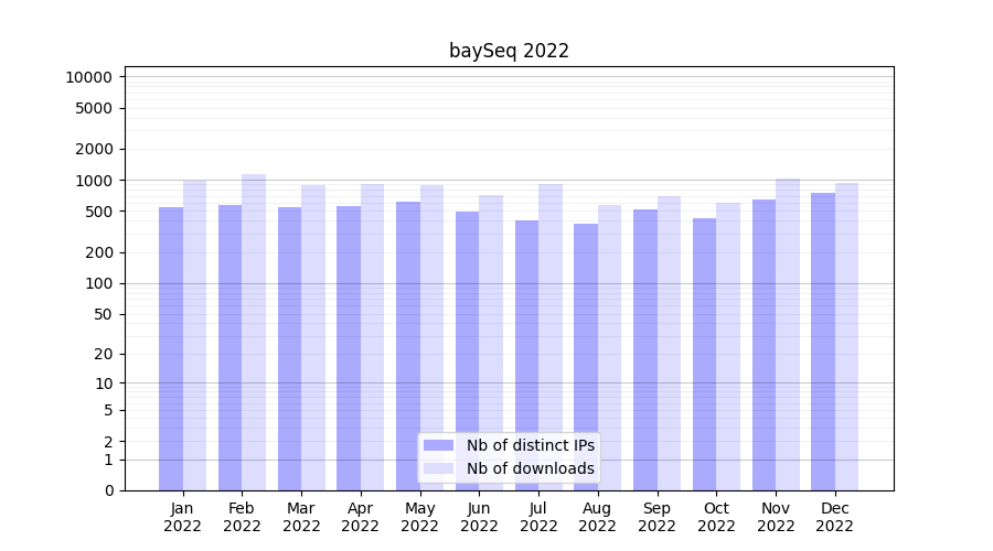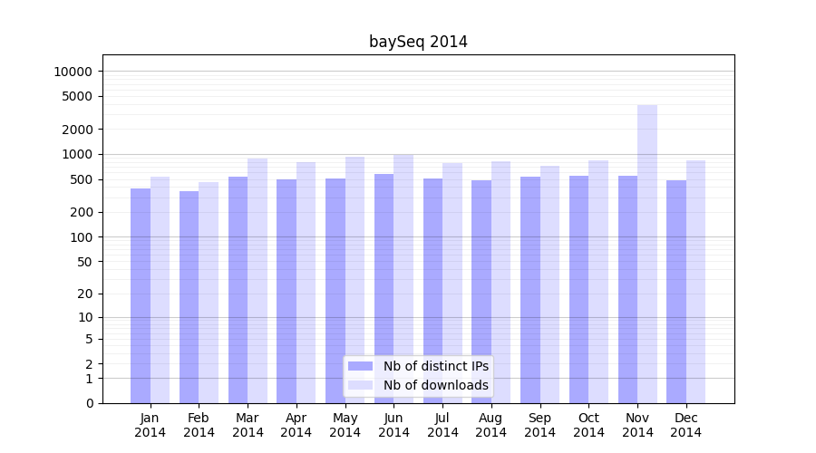 Number of downloads for software package baySeq, year by year, from 2025 back to 2014 (years with no downloads are omitted):