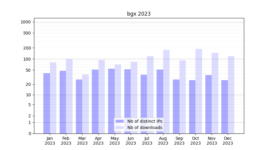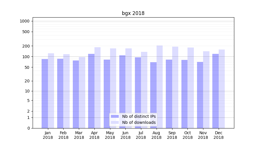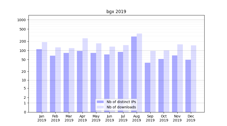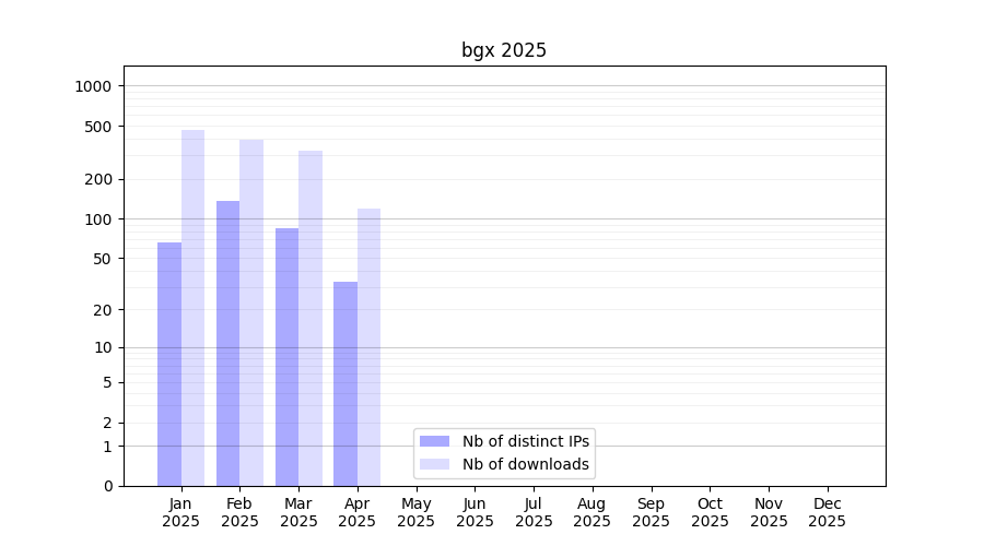 Number of downloads for software package bgx, year by year, from 2025 back to 2014 (years with no downloads are omitted):