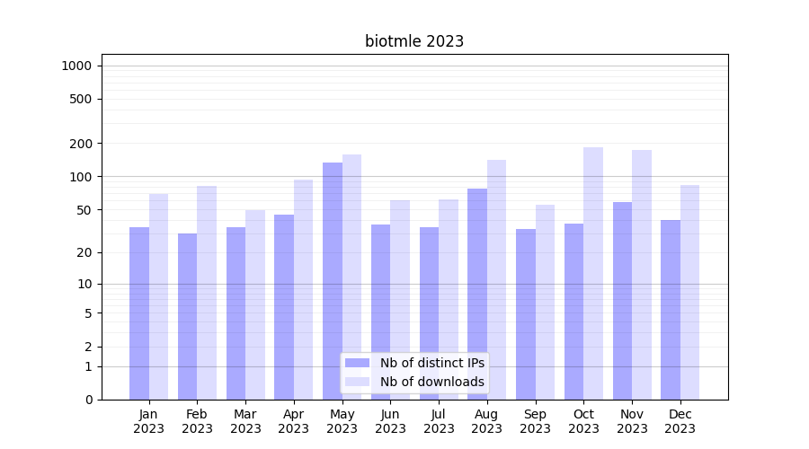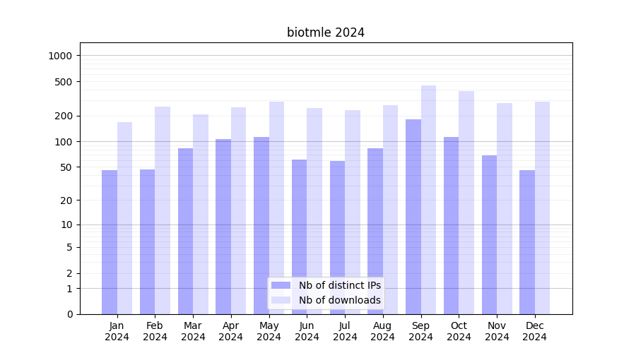 Number of downloads for software package biotmle, year by year, from 2025 back to 2014 (years with no downloads are omitted):
