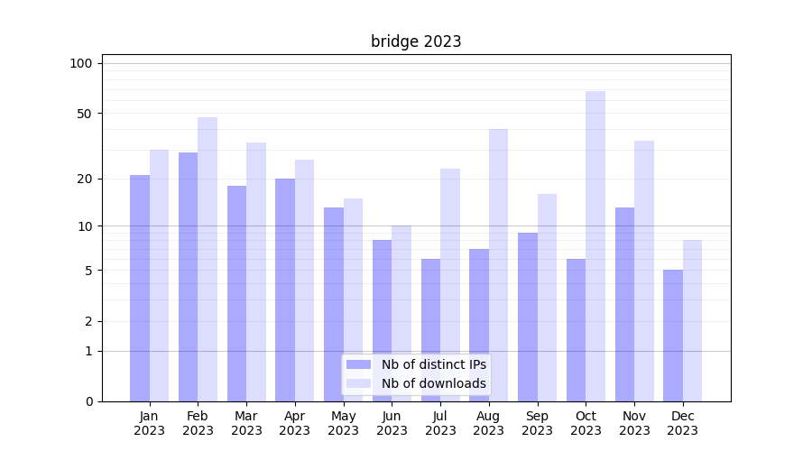 Number of downloads for software package bridge, year by year, from 2025 back to 2014 (years with no downloads are omitted):