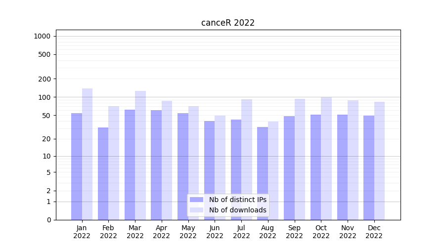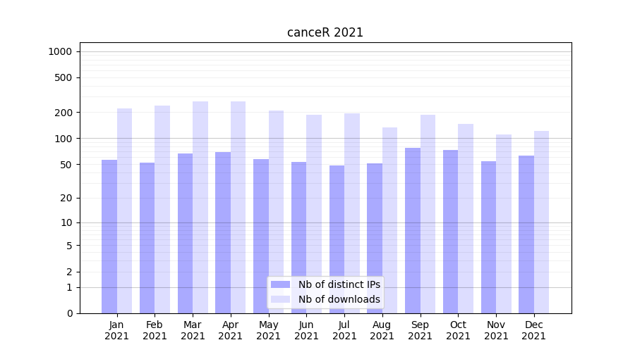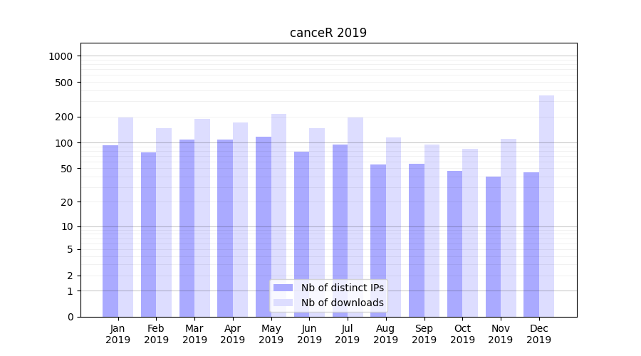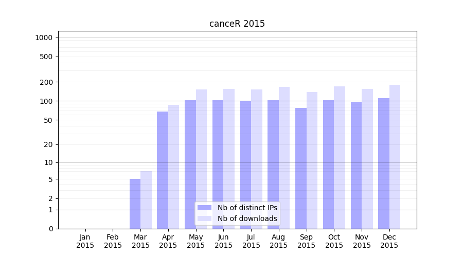 Number of downloads for software package canceR, year by year, from 2025 back to 2014 (years with no downloads are omitted):