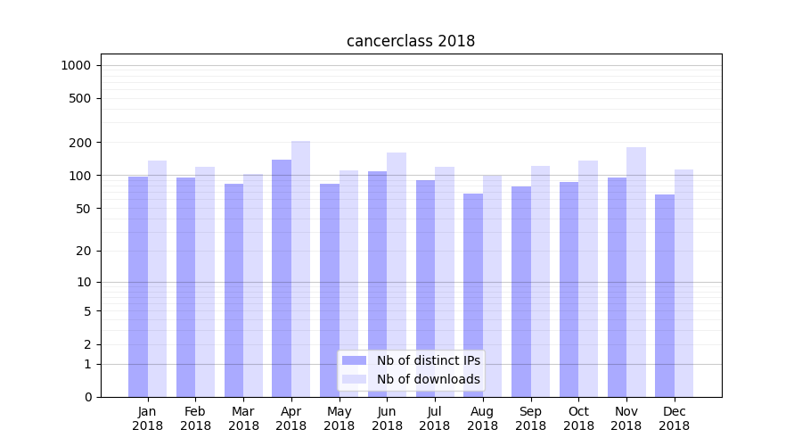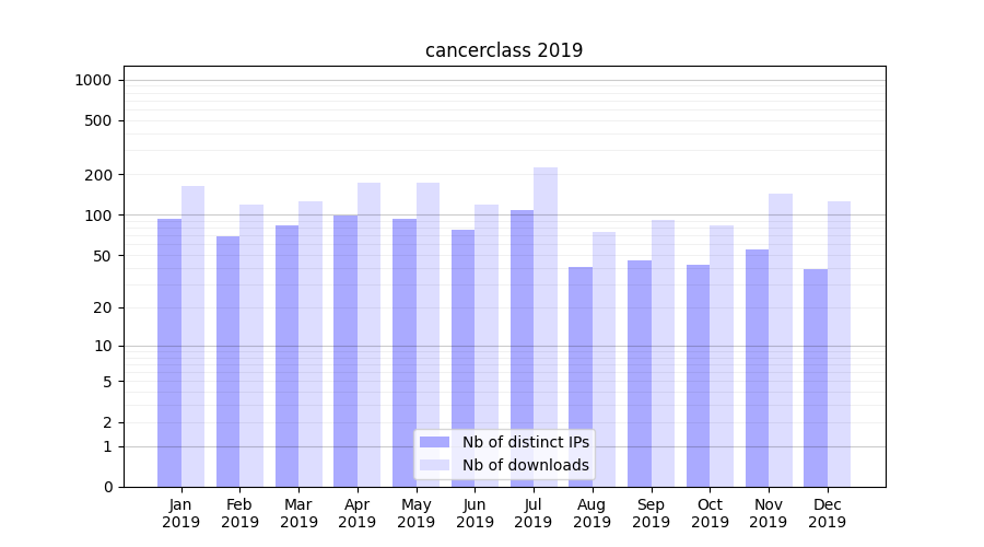 Number of downloads for software package cancerclass, year by year, from 2025 back to 2014 (years with no downloads are omitted):