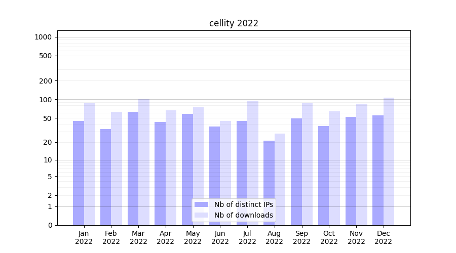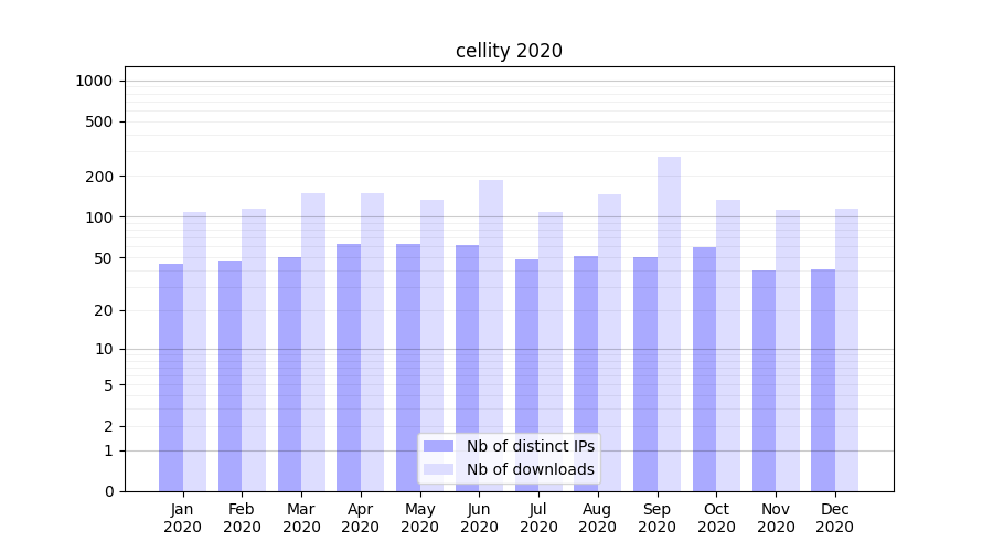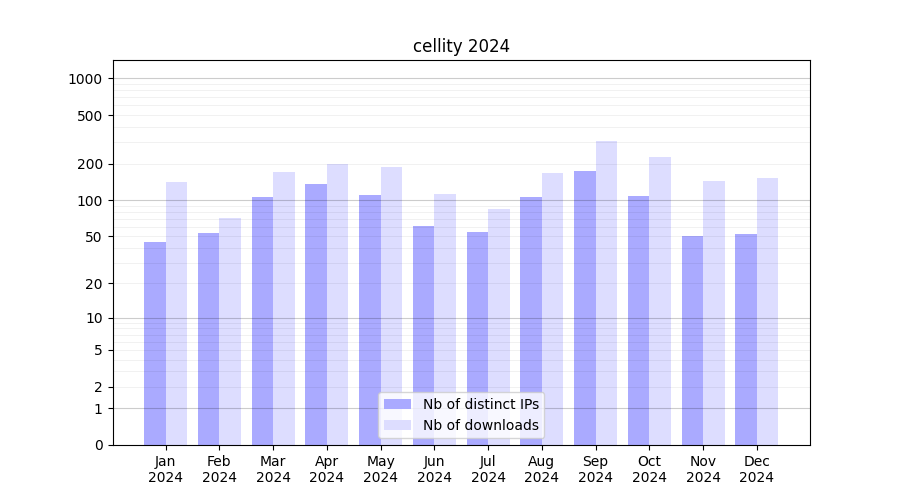 Number of downloads for software package cellity, year by year, from 2025 back to 2014 (years with no downloads are omitted):