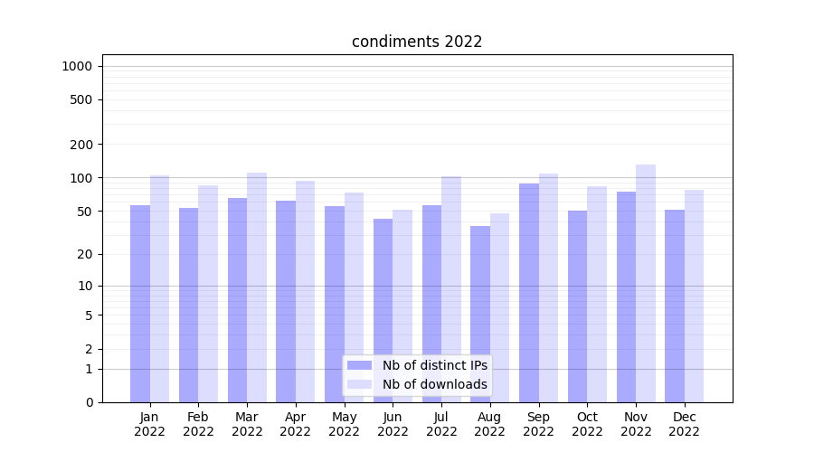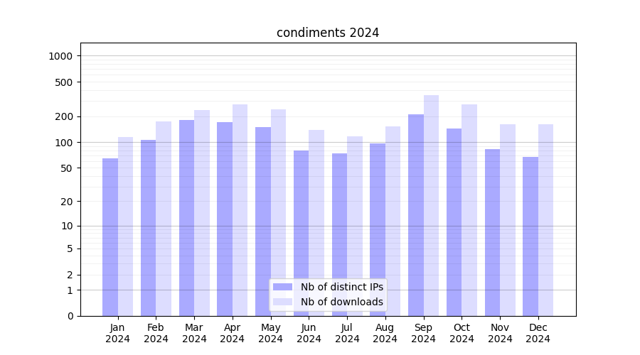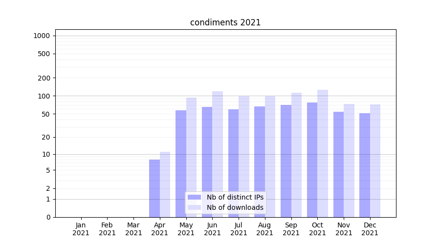 Number of downloads for software package condiments, year by year, from 2025 back to 2014 (years with no downloads are omitted):