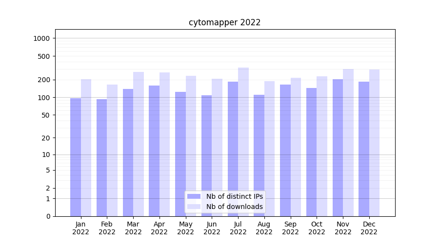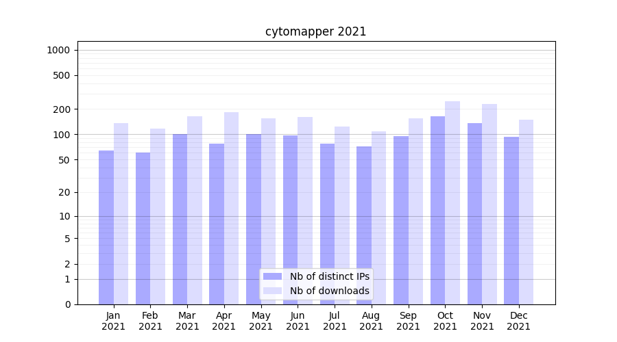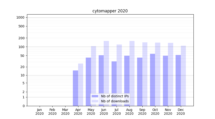 Number of downloads for software package cytomapper, year by year, from 2025 back to 2014 (years with no downloads are omitted):