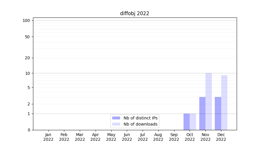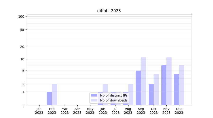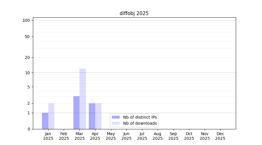 Number of downloads for software package diffobj, year by year, from 2025 back to 2014 (years with no downloads are omitted):