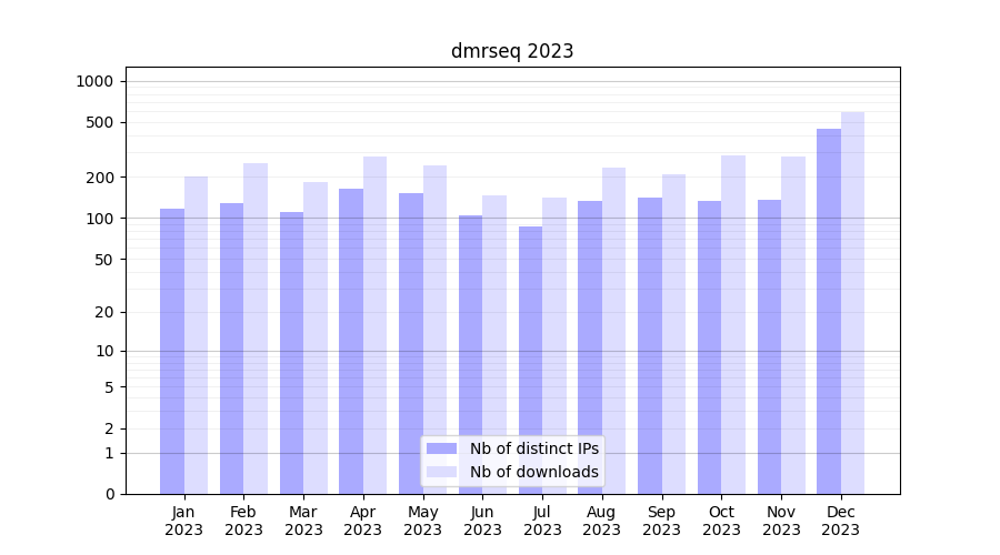 Number of downloads for software package dmrseq, year by year, from 2025 back to 2014 (years with no downloads are omitted):