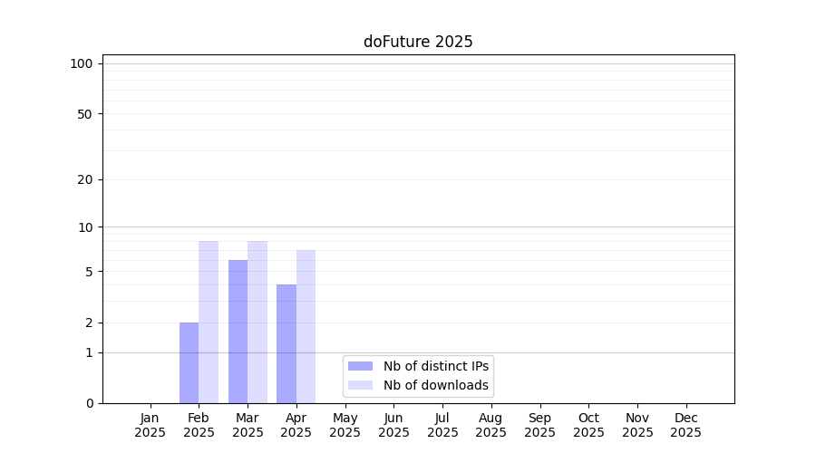 Number of downloads for software package doFuture, year by year, from 2025 back to 2014 (years with no downloads are omitted):