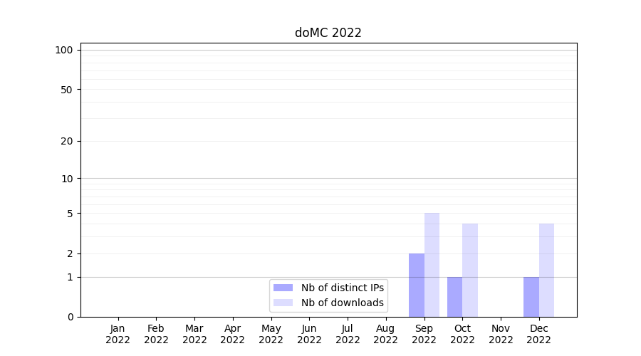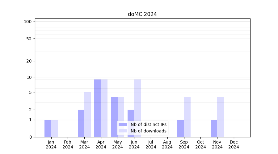 Number of downloads for software package doMC, year by year, from 2025 back to 2014 (years with no downloads are omitted):