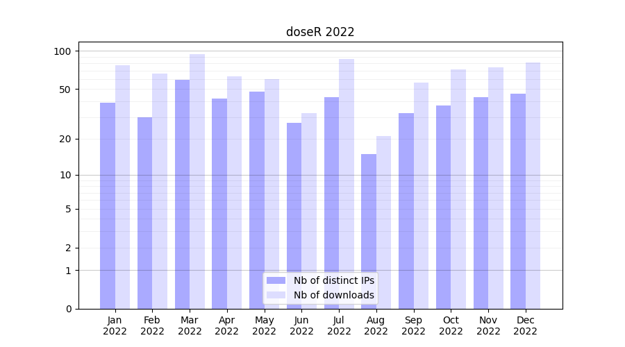 Number of downloads for software package doseR, year by year, from 2025 back to 2014 (years with no downloads are omitted):
