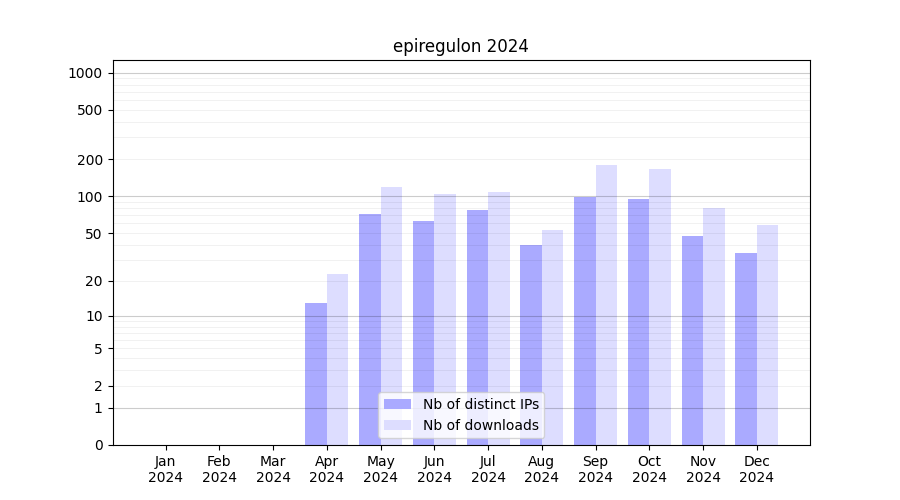 Number of downloads for software package epiregulon, year by year, from 2025 back to 2014 (years with no downloads are omitted):