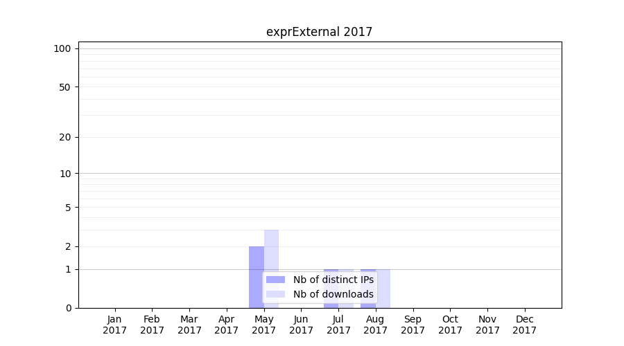 Number of downloads for software package exprExternal, year by year, from 2025 back to 2014 (years with no downloads are omitted):