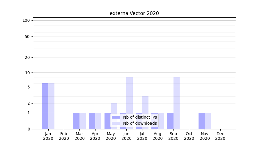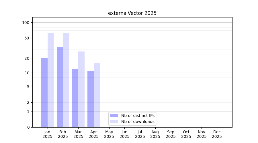 Number of downloads for software package externalVector, year by year, from 2025 back to 2014 (years with no downloads are omitted):