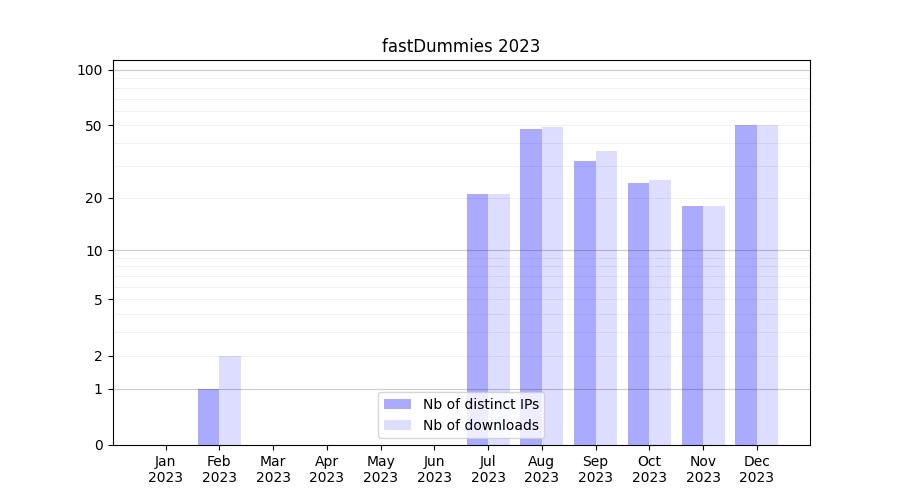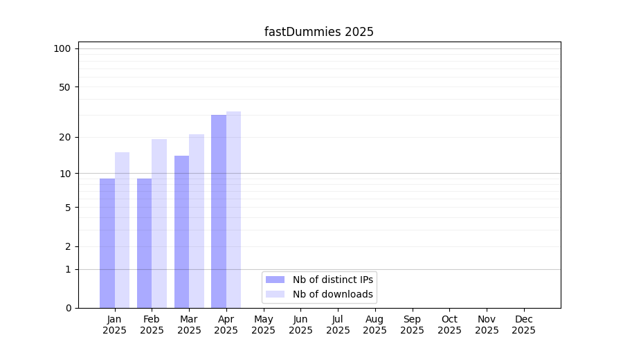 Number of downloads for software package fastDummies, year by year, from 2025 back to 2014 (years with no downloads are omitted):