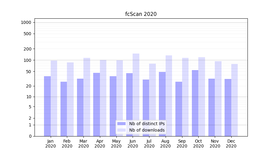 Number of downloads for software package fcScan, year by year, from 2025 back to 2014 (years with no downloads are omitted):