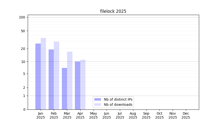 Number of downloads for software package filelock, year by year, from 2025 back to 2014 (years with no downloads are omitted):