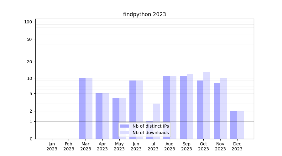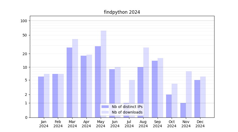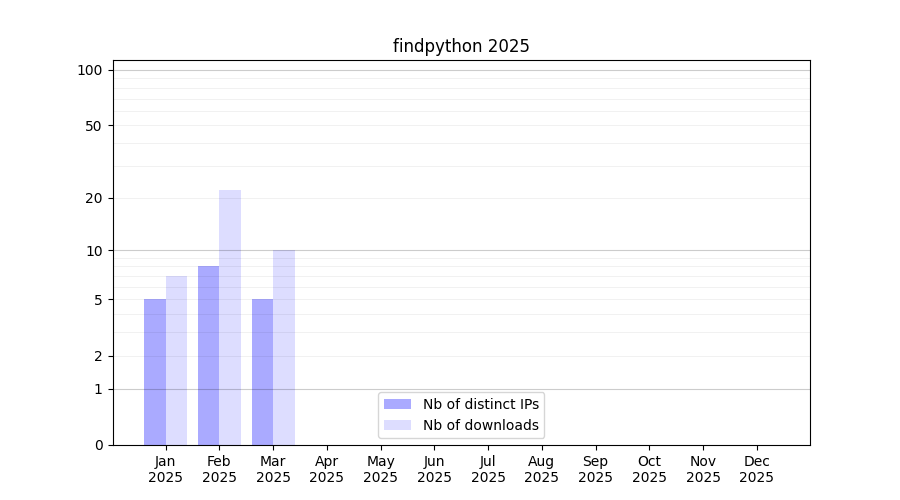 Number of downloads for software package findpython, year by year, from 2025 back to 2014 (years with no downloads are omitted):