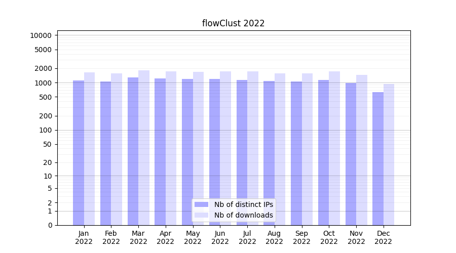 Number of downloads for software package flowClust, year by year, from 2025 back to 2014 (years with no downloads are omitted):