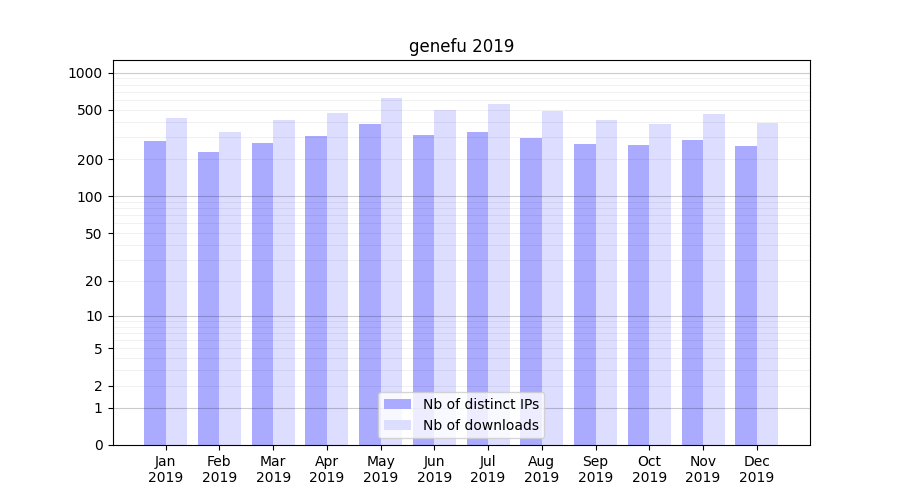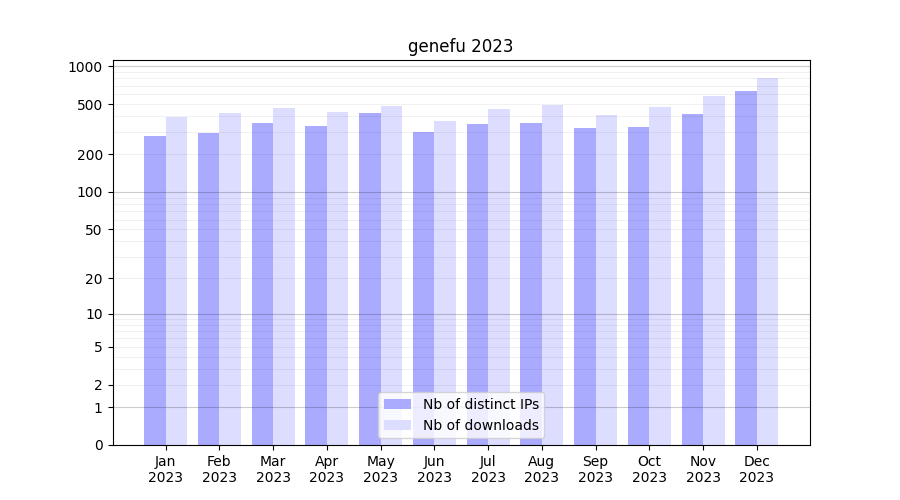 Number of downloads for software package genefu, year by year, from 2025 back to 2014 (years with no downloads are omitted):