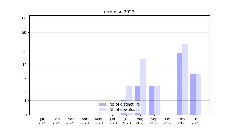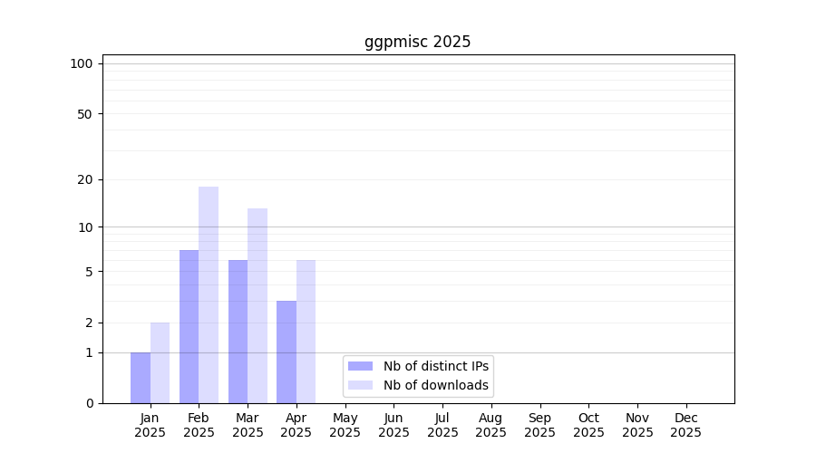 Number of downloads for software package ggpmisc, year by year, from 2025 back to 2014 (years with no downloads are omitted):