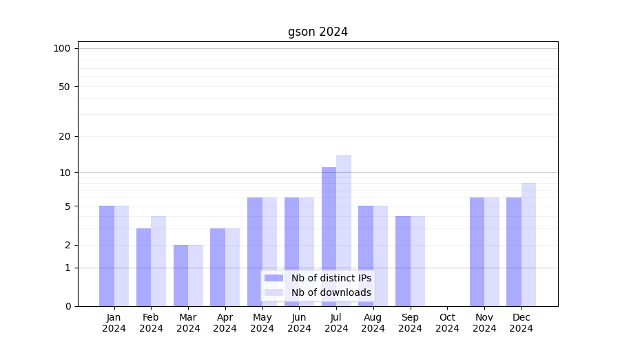 Number of downloads for software package gson, year by year, from 2025 back to 2014 (years with no downloads are omitted):