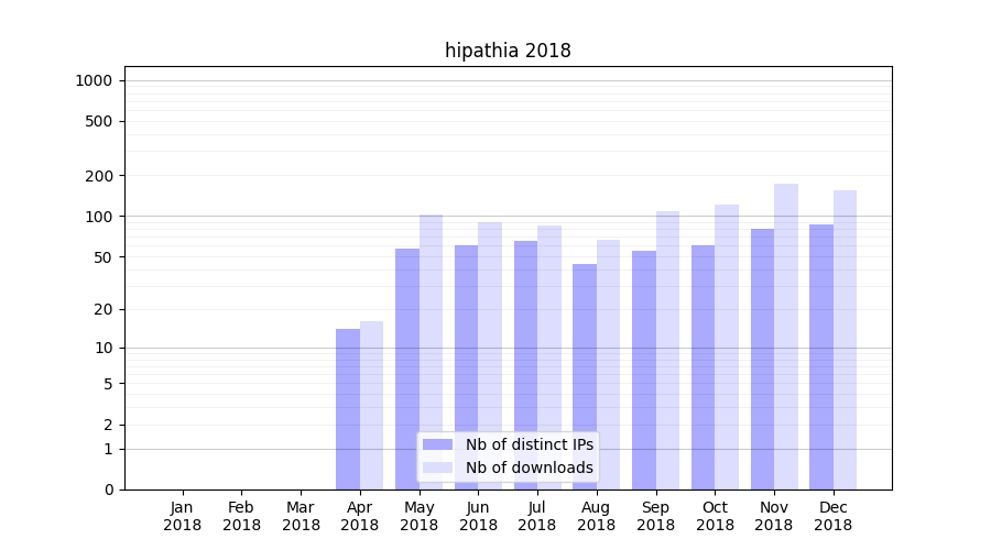 Number of downloads for software package hipathia, year by year, from 2025 back to 2014 (years with no downloads are omitted):