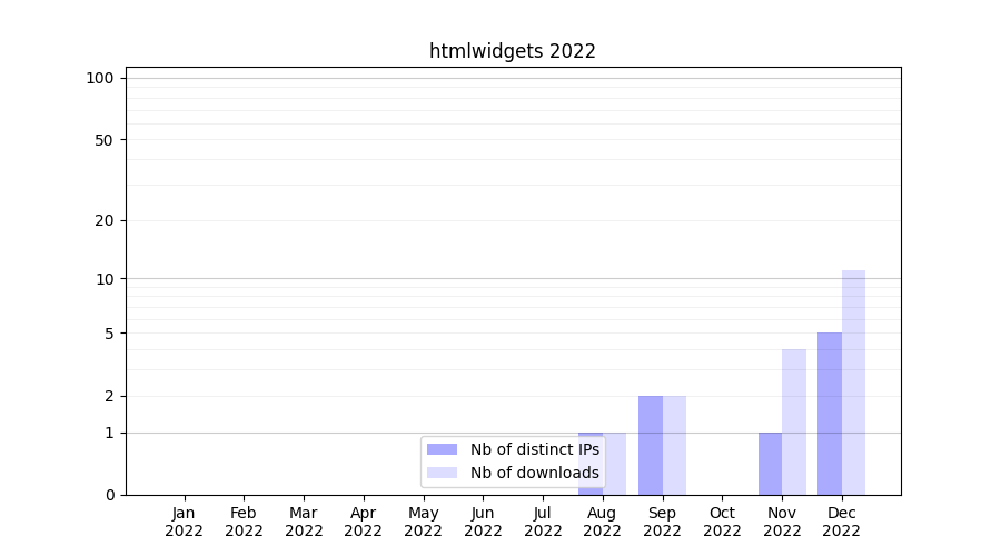Number of downloads for software package htmlwidgets, year by year, from 2025 back to 2014 (years with no downloads are omitted):