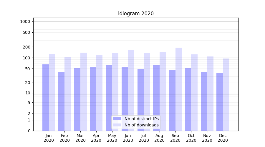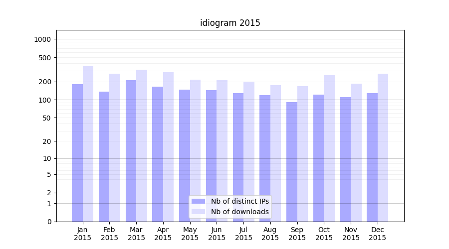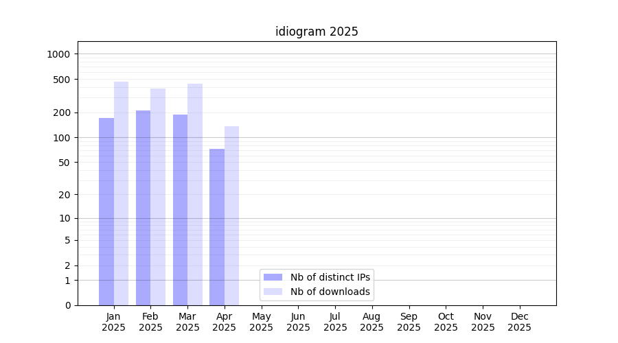 Number of downloads for software package idiogram, year by year, from 2025 back to 2014 (years with no downloads are omitted):