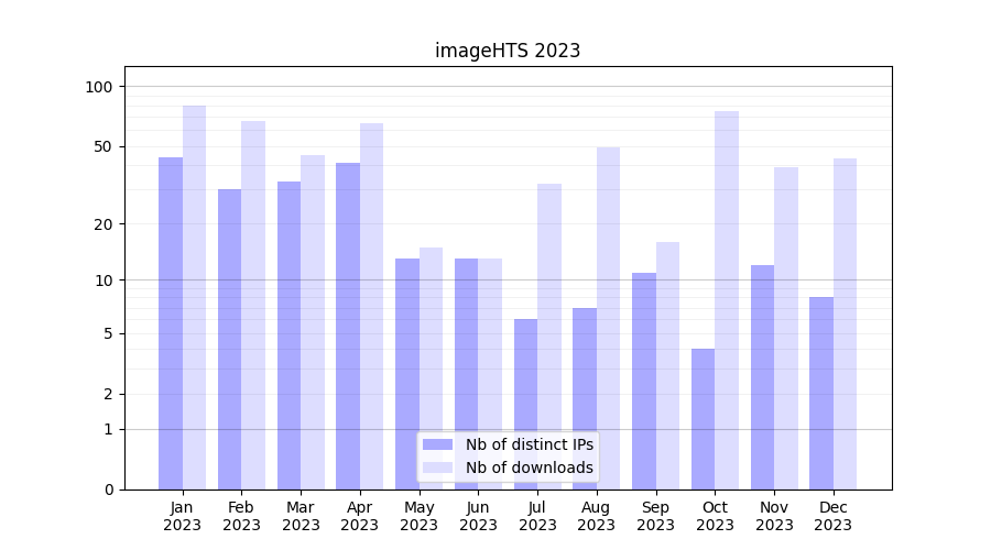 Number of downloads for software package imageHTS, year by year, from 2025 back to 2014 (years with no downloads are omitted):