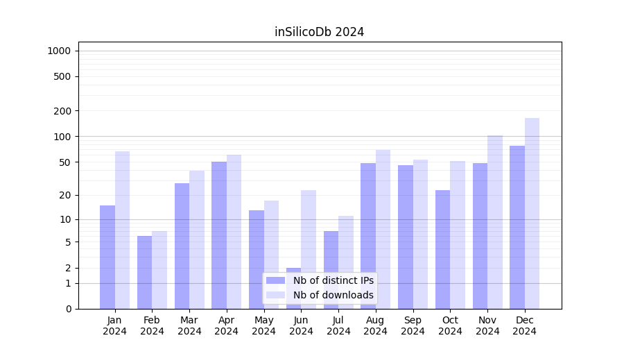 Number of downloads for software package inSilicoDb, year by year, from 2025 back to 2014 (years with no downloads are omitted):