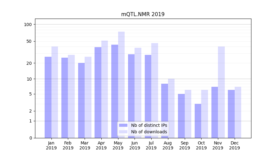 Number of downloads for software package mQTL.NMR, year by year, from 2025 back to 2014 (years with no downloads are omitted):