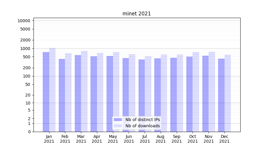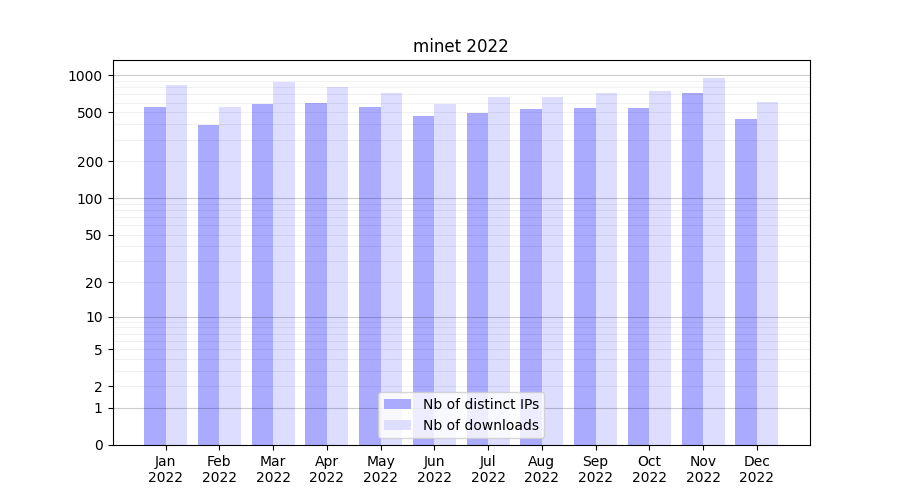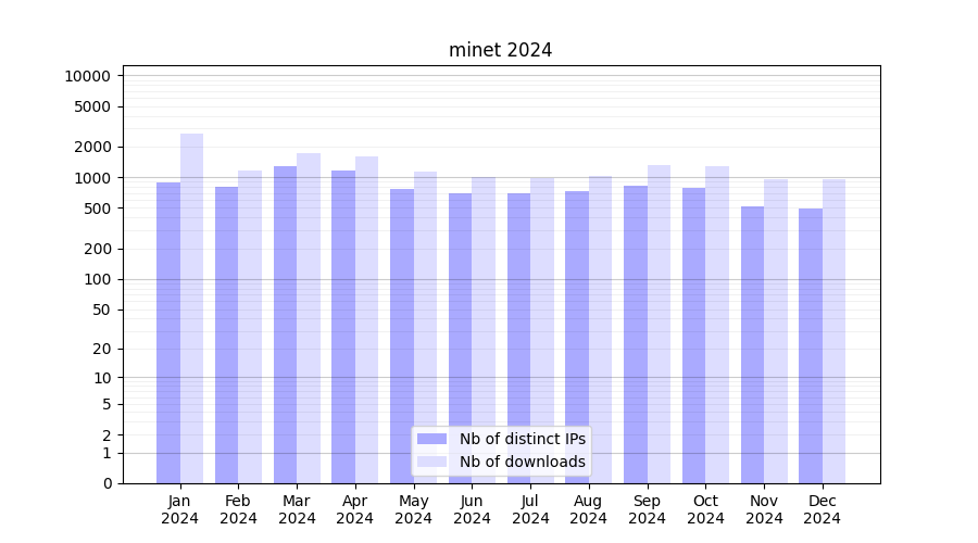 Number of downloads for software package minet, year by year, from 2025 back to 2014 (years with no downloads are omitted):